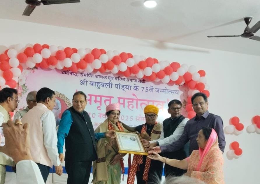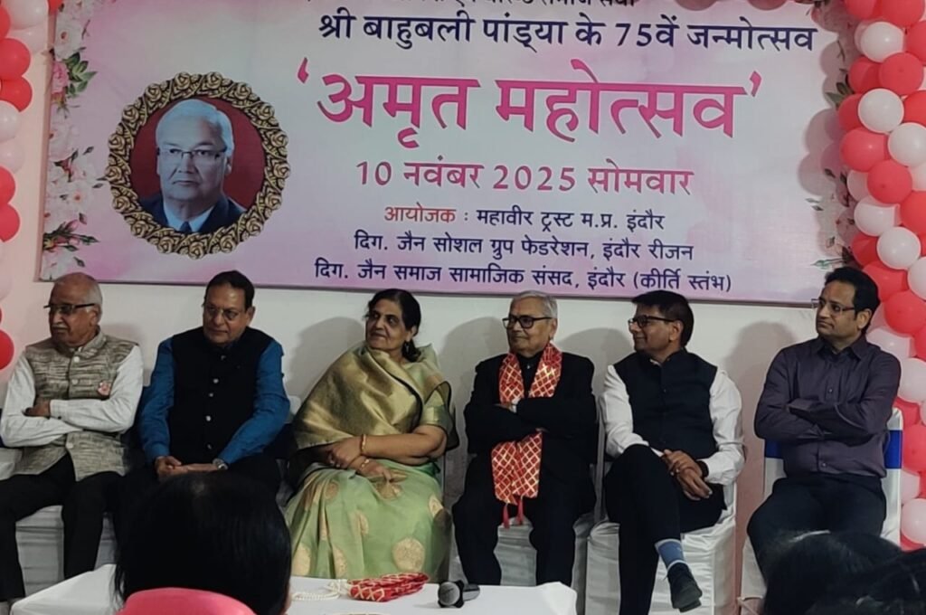इंदौर (राजेश जैन दद्दू )। हर पल समाज सेवा, धर्म और संस्कृति के लिए समर्पित दिगंबर जैन समाज के आयु समृद्ध एवं अनुभव समृद्ध वरिष्ठ समाजसेवी, और सन्मतिवाणी पत्रिका के संपादक बाहुबली पांड्या के कर्मठ एवं गतिशील जीवन के 75 वर्ष पूर्ण होने पर महावीर ट्रस्ट, दिगंबर जैन समाज सामाजिक संसद एवं सोशल ग्रुप फेडरेशन के संयुक्त तत्वावधान में अमृत महोत्सव मनाया गया।