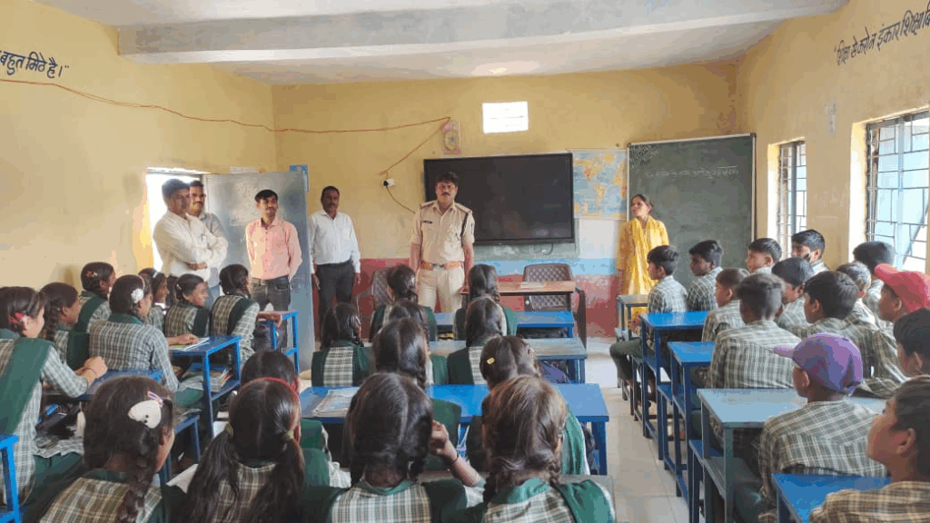 3️⃣ थाना प्रभारी रावटी निरीक्षक सुरेंद्र गडरिया द्वारा शासकीय माध्यमिक विद्यालय ग्राम नायन में बच्चों को जागरूक किया गया।
