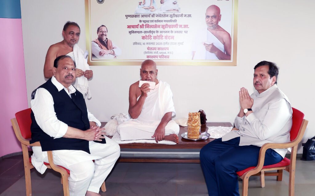 रतलाम/मुंबई, 17 नवंबर। पुण्यसम्राट आचार्य श्री जयंतसेन सूरीश्वर जी महाराज साहेब के पट्टधर एवं वर्तमान गच्छाधिपति आचार्य नित्यसेन सूरीश्वर जी महाराज साहेब मध्य प्रदेश शासन के MSME मंत्री श्री चेतन्य काश्यप के वर्ली सीफ़ेस स्थित निवास स्थल पर पावन पगलिये करने पधारे।