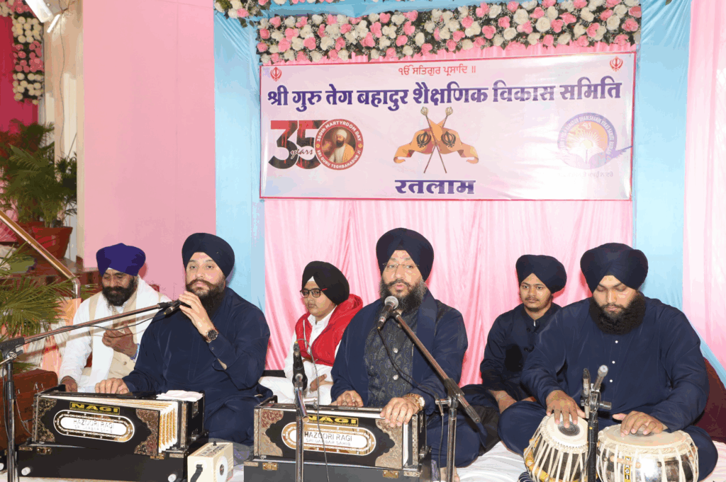 रतलाम। मानवता रक्षक सृष्टि की चादर गुरु तेग बहादुर के 350 वें शहादत वर्ष के उपलक्ष में पंजाबी साहित्य अकादमी और श्री गुरु तेग बहादुर शैक्षणिक विकास समिति के संयुक्त तत्वाधान में कीर्तन दरबार का आयोजन श्री गुरु तेग़ बहादुर एकेडमी अरविंद मार्ग परिसर स्थित खालसा सभा गृह में आयोजित किया गया। जिसमें पंथ प्रसिद्ध कीर्तनिये जात्थे भाई जसकरण पटियाला वाले एवं साथी द्वारा संगत को गुरबाणी गायन से जोडा तथा जसबीर सिंह राणा ने कथा के माध्यम से गुरुतेग बहादुर जी की शहादत को संगत के समक्ष प्रस्तुत किया , ज्ञानी मान सिंह एवं ज्ञानी हंसराज सिंह ने भी गुरु शब्दों का गायन किया। कार्यक्रम में विशेष रूप से पंजाबी साहित्य अकादमी के निर्देशक इंद्रजीत सिंह खनूजा सहायक निर्देशक दीपक गुप्ता तथा क्षेत्रीय समन्वय संयोजक कवलजीत सिंह गांधी ने भी विशेष रूप से अपनी उपस्थिति थे तथा उन्होंने अपने विचारों से आई हुई संगत को अवगत कराया। कार्यक्रम में समाज की होनहार बच्ची नमनदीप कौर टुटेजा को मेधावी छात्रा के रूप में संस्था द्वारा सम्मानित किया गया ।