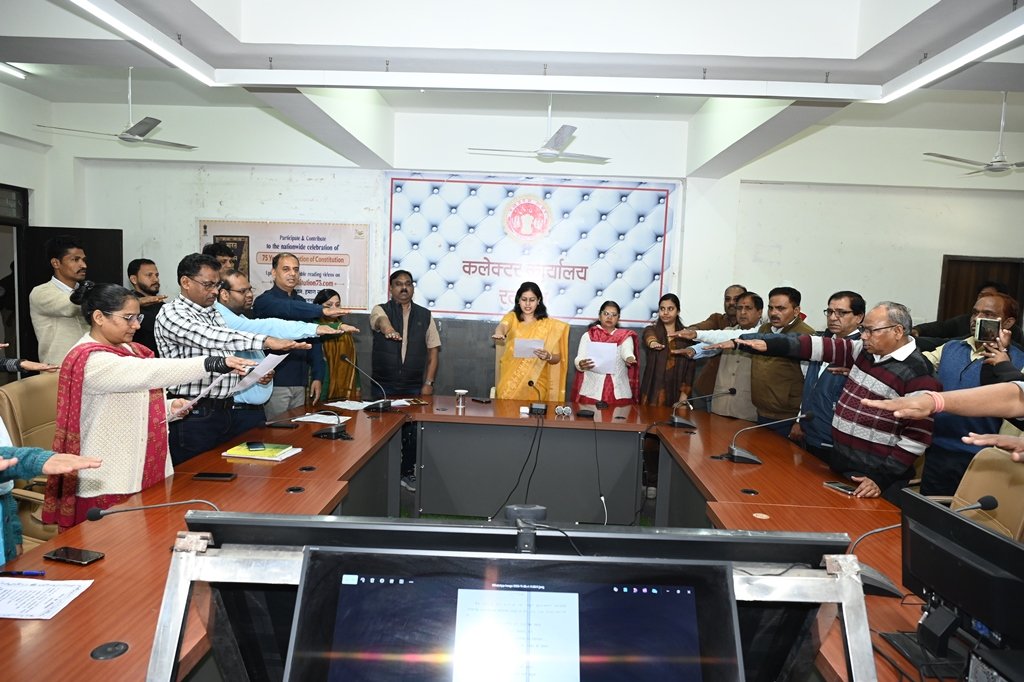 रतलाम 26 नवंबर। संविधान दिवस के अवसर पर आज कलेक्टर कार्यालय में भारतीय संविधान की उद्देशिका का सामूहिक वाचन किया गया। कार्यक्रम में जिला पंचायत सीईओ वैशाली जैन, एसडीएम शहर आर्ची हरित, डिप्टी कलेक्टर श्रीमती राधा महन्त सहित विभिन्न विभागों के जिला अधिकारी एवं कर्मचारी उपस्थित रहे। अधिकारियों ने संविधान निर्माताओं के प्रति कृतज्ञता व्यक्त करते हुए संविधान में निहित मूल्यों न्याय, स्वतंत्रता, समानता और बंधुत्व के पालन का संकल्प लिया। संविधान दिवस पर आयोजित यह कार्यक्रम राष्ट्रीय एकता और लोकतांत्रिक मूल्यों के प्रति समर्पण का संदेश देता है।