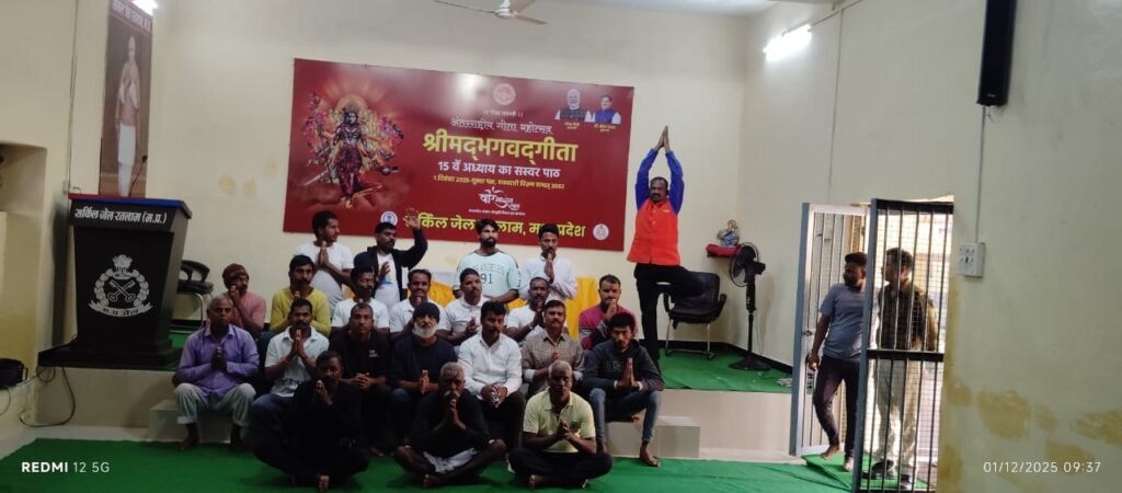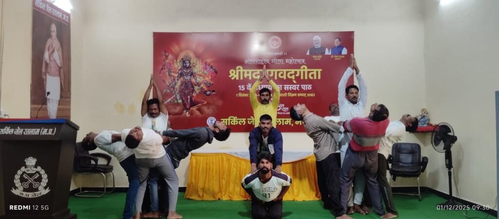 रतलाम। गीता जयंती अंतरराष्ट्रीय गीता महोत्सव वीर भारत न्यास श्रीमदभगवद्गीता 15 वें अध्याय का जिला सर्किल जेल रतलाम अधीक्षक श्री लक्ष्मण सिंह भदौरिया उप जेल अधीक्षक ब्रजेश मकवाने के सानिध्य में समस्त स्टाफ और बंदियों द्वारा सामूहिक पाठ किया गया। साथ ही सामूहिक कुशल योग प्रदर्शन योगगुरु विशाल कुमार वर्मा पतंजलि योगपीठ हरिद्वार युवा भारत जिला प्रभारी रतलाम के मार्गदर्शन में वैदिक मंत्रोच्चारण, सामूहिक सूर्य नमस्कार, योग नृत्य प्रदर्शन, योग कमल नटराज आसन, योग कोविदार वृक्षासन का स्वरूप भी दिया गया।