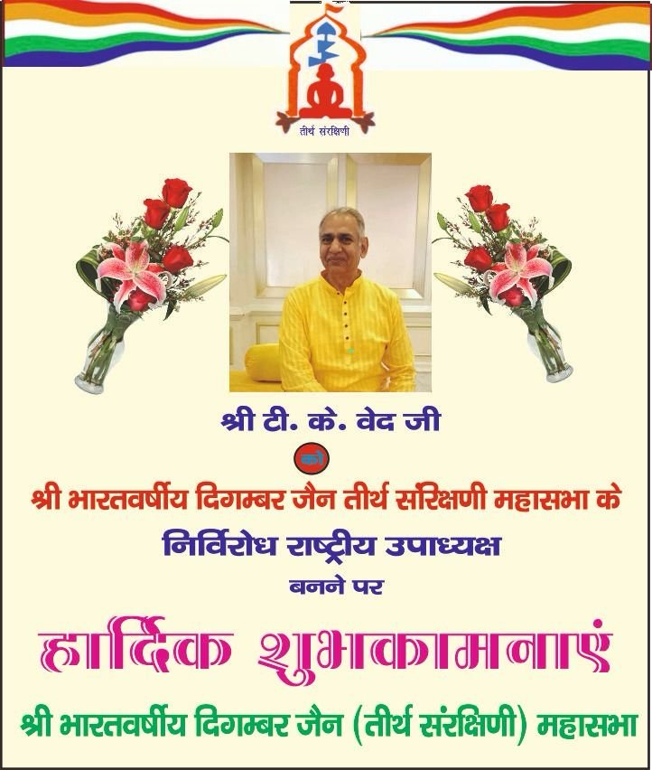 इंदौर (राजेश जैन दद्दू )। दिगंबर जैन समाज इंदौर के एवं पुर्व दिगंबर जैन सोशल ग्रुप फेडरेशन के राष्ट्रीय अध्यक्ष जैन समाज गोरव परम मुनि भक टीके वेद श्री भारत वर्षीय दिगम्बर जैन तीर्थ संरक्षिणी महासभा के निर्विरोध राष्ट्रीय उपाध्यक्ष चुने गए। धर्म समाज प्रचारक राजेश जैन दद्दू ने कहा कि वेद साहब के राष्ट्रीय उपाध्यक्ष बनने से भारत वर्षीय जैन समाज हर्षित हुआ। आप के मनोनीत होने पर महावीर ट्रस्ट के अध्यक्ष अमित कासलीवाल फेडरेशन के राष्ट्रीय अध्यक्ष मनोहर झांझरी वरिष्ठ समाजसेवी डॉ जैनेन्द्र जैन आजाद जी जैन हंसमुख गांधी सुशील पांड्या नरेंद्र वेद मंयक जैन सुभाष काला एवं फेडरेशन की राष्ट्रीय शिरोमणि संरक्षिका श्रीमती पुष्पा कासलीवाल श्रीमती रेखा जैन श्रीफल आदि समाज जन ने बधाई दी ।