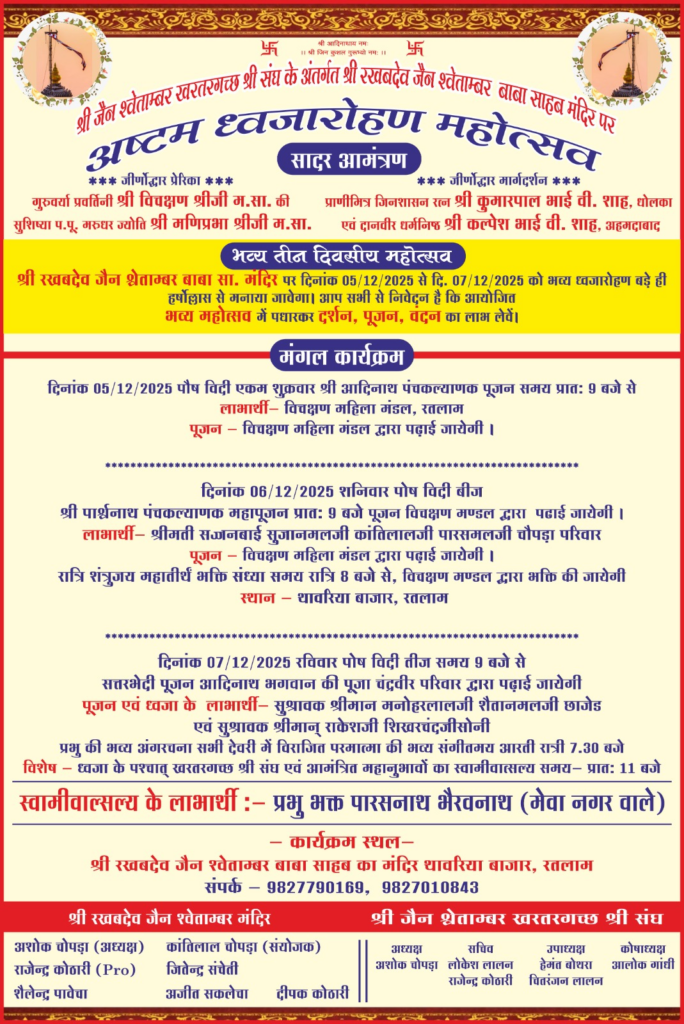 रतलाम। रखब देव बाबा साहब के जैन मंदिर पर अष्टम ध्वजारोहण महोत्सव का तीन दिवसीय भव्य आयोजन 5 दिसंबर से 7 दिसंबर तक बड़े हर्षोल्लास व श्रद्धा-भक्ति के साथ संपन्न होगा। तीनों दिनों में विविध धार्मिक कार्यक्रम, पूजन, आराधना और भक्ति संध्या का आयोजन रखा गया है, जिसमें बड़ी संख्या में श्रद्धालुओं के उपस्थित होने की संभावना है।