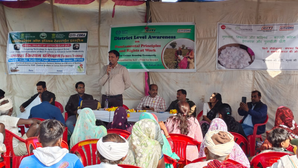 रतलाम, 03 दिसंबर 2025 (बुधवार)। रतलाम जिले के क्लस्टर रावटी के ग्राम नायन में कपास एवं विविध फसलों की खेती करने वाले महिला एवं पुरुष किसानों के लिए सिटी–सीडीआरए, आईएलओ प्रोजेक्ट तथा कस्तूरी कॉटन स्पेशल पायलट प्रोजेक्ट के संयुक्त तत्वावधान में एक भव्य किसान प्रशिक्षण एवं जागरूकता कार्यक्रम आयोजित किया गया। बड़ी संख्या में किसानों ने सहभागिता करते हुए नवीन कृषि तकनीकों, सरकारी योजनाओं और सामाजिक जागरूकता से संबंधित महत्वपूर्ण जानकारियाँ प्राप्त कीं।