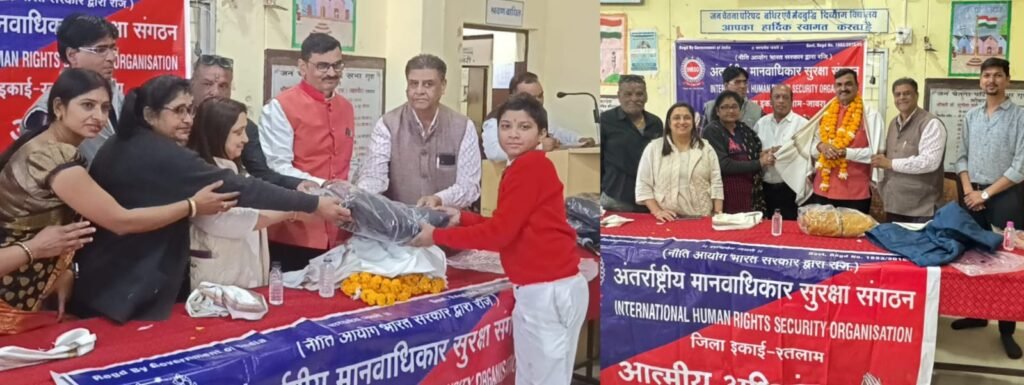 रतलाम। अंतरराष्ट्रीय मानवाधिकार दिवस पर अंतरराष्ट्रीय मानवाधिकार सुरक्षा संगठन, जिला रतलाम द्वारा प्रदेश अध्यक्ष अशोक सिंह एवं संभागीय मंत्री शेखर नाहर के मार्गदर्शन में जन चेतना मूक-बधिर विद्यालय में दिव्यांग विद्यार्थियों के साथ सेवा, सहभागिता एवं संवेदना से भरा विशेष कार्यक्रम आयोजित किया गया। कार्यक्रम के मुख्य सत्र में 82 बच्चों को सर्दी से बचाव हेतु जर्किन का वितरण किया गया, जो अतिथियों और दानदाताओं के कर-कमलों से सम्पन्न हुआ।*प्रारंभिक सहभागिता*दोपहर 12 बजे से संगठन के पदाधिकारियों ने बच्चों के साथ मनोरंजक खेल खिलाए और आत्मीय संवाद किया। बच्चों ने उत्साहपूर्वक गतिविधियों में भाग लिया और प्रथम-द्वितीय रहने वालों को पुरस्कृत किया गया। इसके बाद विद्यार्थियों को स्नेहपूर्वक भोजन कराया गया।*मुख्य कार्यक्रम : 82 जर्किन का वितरण*मुख्य कार्यक्रम दोपहर 2 बजे मां सरस्वती की पूजा एवं दीप प्रज्वलन के साथ प्रारंभ हुआ। मुख्य अतिथि के रूप में जिला जेल अधीक्षक लक्ष्मणकुमार सिंह भदौरिया, जिला विधिक सहायता अधिकारी पूनम तिवारी, संगठन की प्रदेश उपाध्यक्ष सिंधु राज और विद्यालय के अध्यक्ष मुंशीलाल दुबे उपस्थित रहे। विद्यालय के प्राचार्य सतीश तिवारी एवं विद्यालय परिवार ने अतिथियों का स्वागत किया। इसके पश्चात मुख्य सत्र में उपस्थित अतिथियों एवं दानदाताओं के हाथों से 82 विद्यार्थियों को गर्म जर्किन वितरित किए गए, जिससे सर्दी में उन्हें राहत मिल सके। मुख-बधिर बच्चों की सांस्कृतिक प्रस्तुतियों ने सभी का मन मोह लिया और उपस्थित जनों ने तालियों की गूंज से उनका उत्साह बढ़ाया।*सेवा-श्रृंखला की आगे की योजनाएं*जिला अध्यक्ष राजकुमार हरण ने बताया कि यह आयोजन दानदाताओं द्वारा समर्थित सेवा-श्रृंखला का पहला कार्यक्रम है। आगामी दो बड़े कार्यक्रमों में पिपलौदा के दिव्यांग विद्यार्थियों के लिए 50 गद्दों सहित उपयोगी सामग्री का वितरण किया जाएगा।विद्यालय के 99 वर्षीय अध्यक्ष मुंशीलाल दुबे का शाल एवं मोतियों की माला से सम्मान किया गया।दानदाताओं अशोक झामर, अभय मंडलेचा, श्रीमती प्रतिभा मंडलेचा और दिलीप भंडारी (कालूखेड़ा) का भी शाल और माला से बहुमान किया गया।*अतिथियों के विचार*विशिष्ट अतिथि पूनम तिवारी ने मानवाधिकारों पर सारगर्भित वक्तव्य देते हुए हर संभव सहायता उपलब्ध कराने का आश्वासन दिया। मुख्य अतिथि भदौरिया ने अपने संबोधन में मानवाधिकारों के महत्व और दिव्यांग विद्यार्थियों की आवश्यकताओं पर प्रकाश डाला। उन्होंने कहा कि ऐसे कार्यक्रम समाज में संवेदनशीलता और सकारात्मकता को बढ़ाते हैं। विद्यालय में पहली बार आने पर उन्होंने प्रसन्नता व्यक्त करते हुए बच्चों के कल्याण हेतु ₹