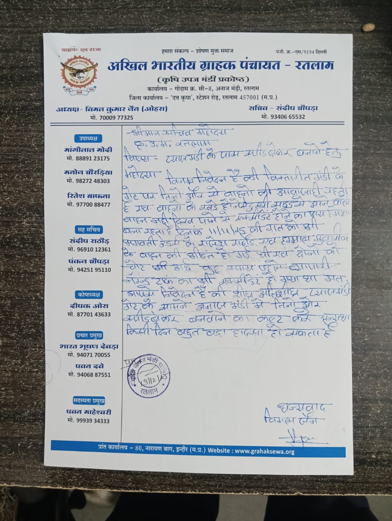 रतलाम। अखिल भारतीय ग्राहक पंचायत कृषि उपज मंडी प्रकोष्ठ ने अध्यक्ष विमल जैन के नेतृत्व मे मंडी सचिव श्रीमती लक्ष्मी भंवर को मंडी प्रांगण मे आ रही समस्या के लिए और हो रहे एक्ससिडेंट के संबंध मे ज्ञापन दिया गया. इस अवसर पर संदीप राठौर, दीपक खेडावाला, पवन दवे आदि पदाधिकारी उपस्तिथ थे.। अध्यक्ष विमल जैन ने बताया की मंडी प्रांगण मे आने के लिए चारो और से भारी वाहनों की आवाजही रहती है और मंडी गेट के चारो साइड स्पीड बेकर नहीं होने से अभी विगत दिनों मे कई भाइयो के वाहन क्षितीग्रस्त हो कर एक्सीएडेंट हुए है, जिससे साथियो की जान माल का नुकशान हुआ। अतः मंडी के चारो साइड रोड पर स्पीड बेकर बनाय जावे।