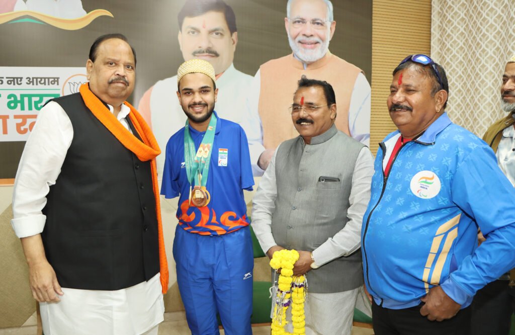 रतलाम। सूक्ष्म, लघु एवं मध्यम उद्यम मंत्री चेतन्य काश्यप ने दुबई में एशियन यूथ पैरा ओलम्पिक तैराकी स्पर्धा में रतलाम, प्रदेश एवं देश का नाम रोशन करने वाले प्रतिभावान दिव्यांग तैराक अब्दुल कादिर इंदौरी का अभिनंदन किया | श्री काश्यप ने अब्दुल के उज्जवल भविष्य की कामना करते हुए कहा कि 25 वर्ष पूर्व खेल चेतना मेला की शुरुवात जिस उद्देश्य से की गई थी , वो पूरा होता दिख रहा है। अब्दुल ने एशियन यूथ पैरा ओलम्पिक में 3 गोल्ड एवं 1 कांस्य पदक जीतकर दुनियाभर में रतलाम का नाम रोशन किया है। ज्ञातव्य है कि अब्दुल ने खेल चेतना मेला से अपनी प्रतिभा दिखाना प्रारंभ की थी। अब्दुल के अभिनंदन के दौरान भाजपा जिलाध्यक्ष प्रदीप उपाध्याय, क्रीड़ा भारती जिला सचिव अनुज शर्मा, कोच राजा राठौड़ आदि उपस्थित रहे।