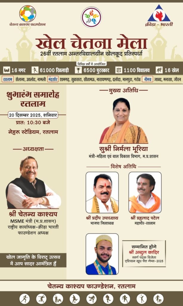 रतलाम, 19 दिसंबर। क्रीड़ा भारती एवं चेतन्य काश्यप फाउंडेशन के तत्वावधान में 20 से 23 दिसंबर तक आयोजित होने वाले खेल चेतना मेला का भव्य शुभारंभ शनिवार को होगा। नेहरू स्टेडियम में आयोजित समारोह में मुख्य अतिथि महिला एवं बाल विकास विभाग मंत्री निर्मला भूरिया होगी, विशेष अतिथि महापौर प्रहलाद पटेल एवं भाजपा जिलाध्यक्ष प्रदीप उपाध्याय रहेंगे। कार्यक्रम की अध्यक्षता क्रीड़ा भारती के राष्ट्रीय कार्याध्यक्ष, फाउंडेशन अध्यक्ष एवं सूक्ष्म, लघु एवं मध्यम उद्यम मंत्री चेतन्य काश्यप करेंगे। इस अवसर पर एशियन यूथ पैरा गेम्स में स्वर्ण पदक विजेता अब्दुल कादिर भी सम्मानित होंगे।
