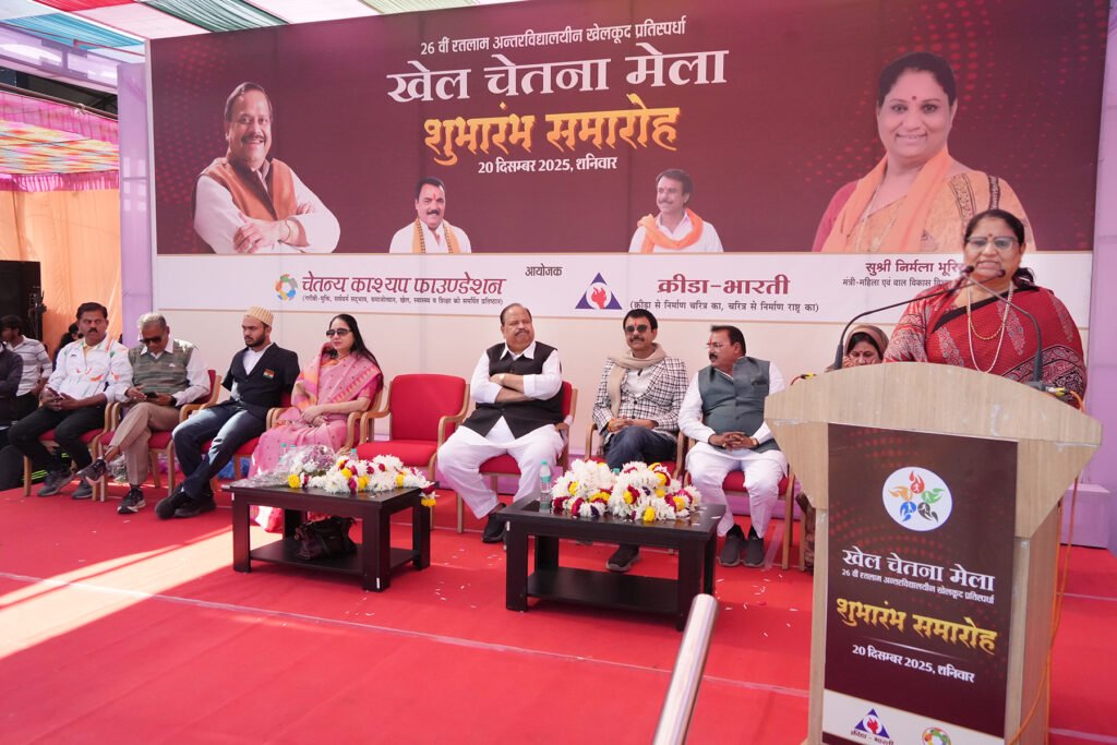 रतलाम, 20 दिसंबर। क्रीड़ा भारती एवं चेतन्य काश्यप फाउंडेशन के तत्वावधान में आयोजित चार दिवसीय खेल चेतना मेला का भव्य शुभारंभ हुआ। नेहरू स्टेडियम में आयोजित समारोह में मुख्य अतिथि महिला एवं बाल विकास विभाग मंत्री निर्मला भूरिया, विशेष अतिथि महापौर प्रहलाद पटेल एवं भाजपा जिलाध्यक्ष प्रदीप उपाध्याय रहे। कार्यक्रम की अध्यक्षता क्रीड़ा भारती के राष्ट्रीय कार्याध्यक्ष, फाउंडेशन अध्यक्ष एवं सूक्ष्म, लघु एवं मध्यम उद्यम मंत्री चेतन्य काश्यप ने की। इनके साथ निगम अध्यक्ष मनीषा शर्मा, प्रणेता श्रीमती नीता काश्यप, क्रीड़ा भारती जिलाध्यक्ष डॉ. गोपाल मजावदिया, सचिव अनुज शर्मा, खेल चेतना मेला आयोजन समिति सचिव मुकेश जैन उपस्थित रहे। समारोह में एशियन यूथ पैरा गेम्स में स्वर्ण पदक विजेता अब्दुल कादिर को सम्मानित किया गया।