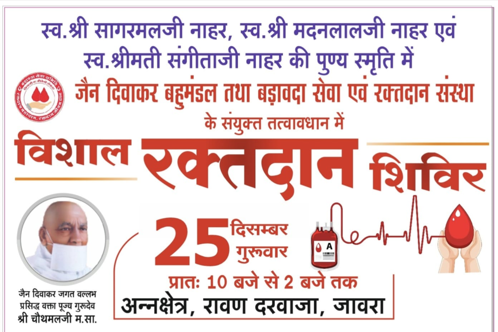 जावरा (अभय सुराणा) । स्वर्गीय सागरमलजी स्वर्गीय मदनलालजी . स्वर्गीय श्रीमती संगीता नाहर की स्मृति में दिनांक 25 दिसंबर को विशाल रक्तदान शिविर का आयोजन अन्नक्षेत्र रावण दरवाजा जावरा में समय प्रातः 10 से 2 बजे तक किया जा रहा है।