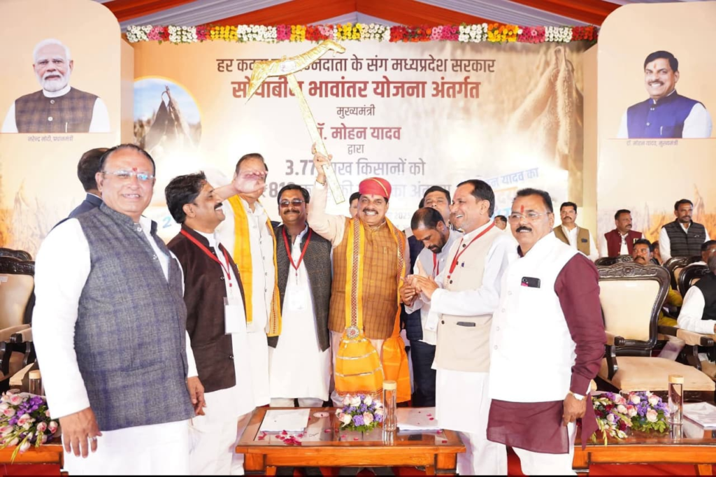 रतलाम। मध्य प्रदेश के लोकप्रिय मुख्यमंत्री डॉक्टर श्री मोहन जी यादव के रतलाम जिले में आगमन पर जावरा भगत सिंह कॉलेज परिसर में आयोजित कार्यक्रम में भाजपा किसान मोर्चा जिला रतलाम के जिला अध्यक्ष राम सिंह सिसोदिया जिला महामंत्री बद्रीलाल चौधरी रतलाम जिले में अत्यधिक वर्षा होने से खरीफ फसलों को भारी नुकसान हुआ था जिस पर मुख्यमंत्री जी ने करोड़ों रुपए की राहत राशि किसान भाइयों के खातों में ट्रांसफर की थी एवं आज 810 करोड रुपए की राशि सोयाबीन भावांतर किसान भाइयों के खातों में ट्रांसफर किया जिस पर सभी किसान भाइयों की ओर से माननीय मुख्यमंत्री जी को लकड़ी का हल प्रतिक स्वरूप भेंट कर ,पगड़ी पहना कर स्वागत करते हुए आभार व्यक्त किया एवं धन्यवाद दिया। वर्तमान में जिले के किसान भाइयों की प्रमुख समस्या प्रधानमंत्री फसल बीमा राशि प्रदाय करने सिंचाई की बिजली 3 फेस दिन में देने यूरिया खाद की समस्या को देखते हुए और अधिक खाद जिले में प्रदायक करने की मांग की गई।
