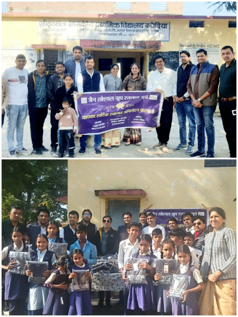 रतलाम। कड़ाके की ठंड और शीतलहर को देखते हुए जैन सोश्यल ग्रुप रतलाम यूथ द्वारा सेवा की एक पहल की गई। ग्रुप की ओर से ग्राम बड़ोदिया स्थित शासकीय माध्यमिक विद्यालय के 122 छात्र-छात्राओं को स्वेटर वितरित किए गए। ठिठुरन भरी ठंड में गरम कपड़े पाकर स्कूली बच्चों के चेहरे खुशी से खिल उठे इस पुनीत सेवा कार्य का लाभ ग्रुप सदस्य गर्वित गोखरू ने लिया