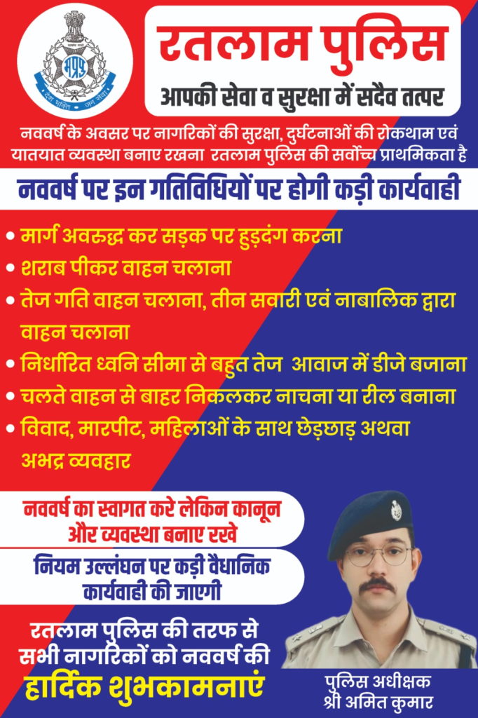 रतलाम पुलिस सभी नागरिकों से अपील करती है कि नववर्ष का स्वागत शांतिपूर्ण, सुरक्षित एवं कानून के दायरे में रहकर करें। भीड़भाड़ वाले स्थानों पर सतर्कता बनाए रखें तथा स्वयं जागरूक रहते हुए दूसरों को भी जागरूक करें। किसी भी संदिग्ध गतिविधि या अप्रिय घटना की सूचना तत्काल नजदीकी पुलिस थाना अथवा डायल-112 पर दें।