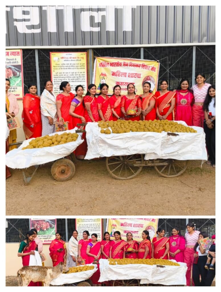 कसरावद। राष्ट्रसंत परमपूज्य गुरुदेव कमल मुनि जी कमलेश म. सा. की प्रेरणा से गठित, अखिल भारतीय जैन दिवाकर विचार मंच महिला शाखा कसरावद के द्वारा नववर्ष एवं मकर संक्रांति के पावन अवसर पर माधव न्यास गोशाला में गायों की पूजा कर उन्हें सवा मन (65 किलो) लापसी के लड्डू एवं चारा खिलाया ,एवं मंच की सदस्यों ने हल्दी कुमकुम कर एक दूसरे को मिठाई खिला कर गिफ्ट दिए ओर नववर्ष की बधाई दी तथा वर्षीतप तपस्वी विधि जी कवाड़ के तप की अनुमोदना की।