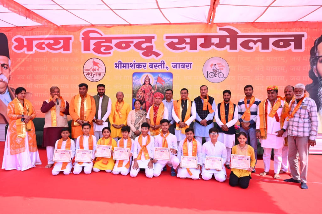 जावरा (अभय सुराणा)। राष्ट्रीय स्वयंसेवक संघ के शताब्दी वर्ष निमित्त भीमाशंकर बस्ती में भव्य हिंदू सम्मेलन का आयोजन सरस्वतीपुरम पहाड़िया रोड जावरा पर सम्पन्न हुआ। सबसे पहले अतिथिगण द्वारा माल्यार्पण एवं दीप प्रज्वलन किया गया अमृत वचन बस्ती कार्यवाह रविराज सिंह ने बोला हिंदू जगे तो विश्व जगेगा संघ गीत की प्रस्तुति सुप्रसिद्ध गायिका प्रियंका सुराणा द्वारा दी गई। गीत के उपरांत बस्ती के ही स्कूल महावीर जैन नेशनल के बच्चों द्वारा सामूहिक हनुमान चालीसा एवं नृत्य की प्रस्तुति दी गई।