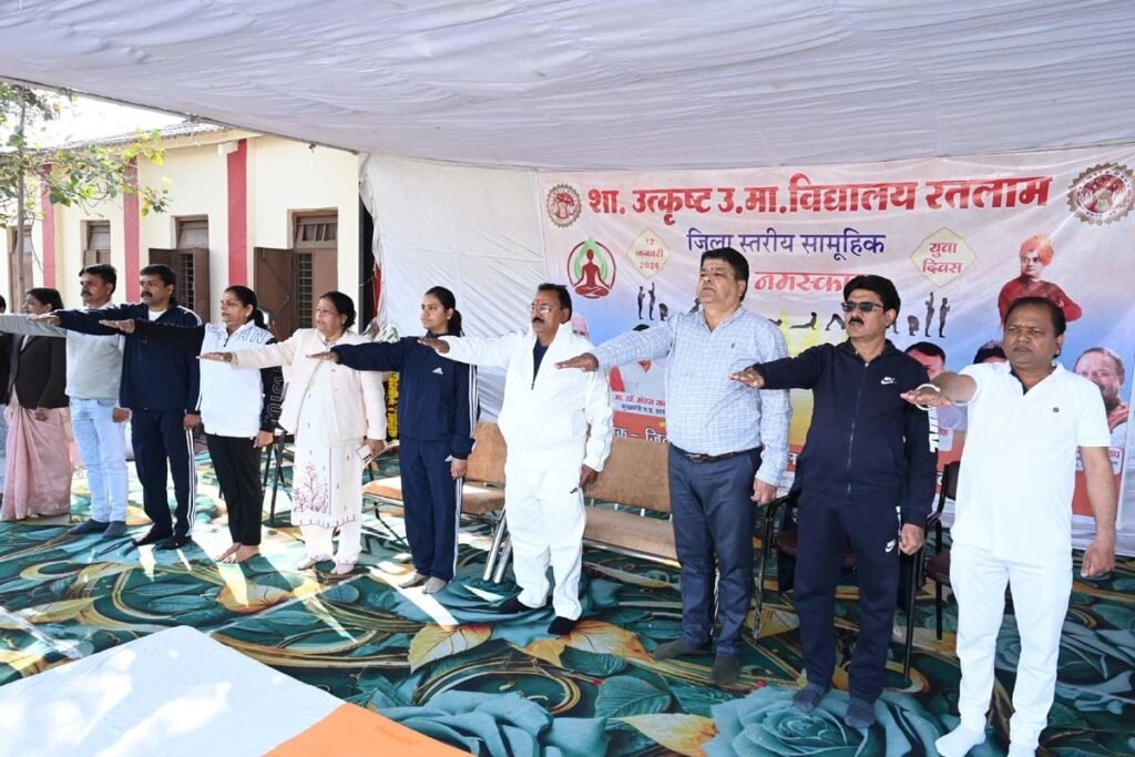 रतलाम 12 जनवरी। स्वामी विवेकानंद के जन्मदिवस युवा दिवस के अवसर पर रतलाम जिले में भी सामूहिक सूर्य नमस्कार तथा प्राणायाम का आयोजन किया गया। जिले की सभी शैक्षणिक संस्थाओं के साथ ही जिला स्तरीय कार्यक्रम रतलाम के उत्कृष्ट विद्यालय परिसर में आयोजित किया गया जहां जिला अध्यक्ष श्री प्रदीप उपाध्याय, एसडीएम सुश्री आर्ची हरित, जिला शिक्षा अधिकारी श्रीमती अनीता सागर एवं स्कूली विद्यार्थी सम्मिलित हुए। इस अवसर पर मां सरस्वती तथा स्वामी विवेकानंद जी के चित्र पर अतिथियों द्वारा माल्यार्पण किया गया। स्वामी विवेकानंद जी के रिकॉर्ड संदेश का रेडियो प्रसारण सुना गया। मुख्यमंत्री डॉ. मोहन यादव का संदेश भी सुना गया। सामूहिक सूर्य नमस्कार में प्रमुख योग प्रशिक्षक द्वारा योगाभ्यास कराया गया। रेडियो पर प्रसारित निर्देशों के अनुसार सभी के द्वारा योग अभ्यास किया गया सूर्य नमस्कार में प्रार्थना मुद्रा, पाद हस्तासन, अश्व संचालनासन, पर्वतासन, अष्टांग नमस्कार, भुजंगासन किए गए।