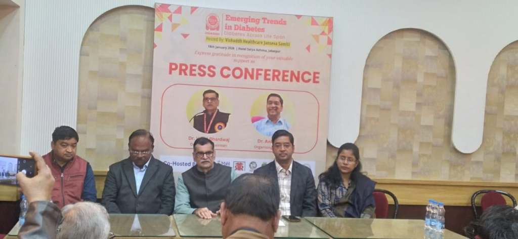 जबलपुर। विशुद्ध हेल्थकेयर जनसेवा समिति द्वारा डायबिटीज जैसी गंभीर और तेजी से बढ़ती बीमारी के प्रति जन-जागरूकता बढ़ाने तथा चिकित्सा क्षेत्र में हो रहे नवीनतम शोध एवं तकनीकों पर चर्चा के उद्देश्य से एक प्रेस कॉन्फ्रेंस का आयोजन दिनांक 18-01-2026 होटल सत्य अशोका, राइट टाउन, जबलपुर में किया गया।