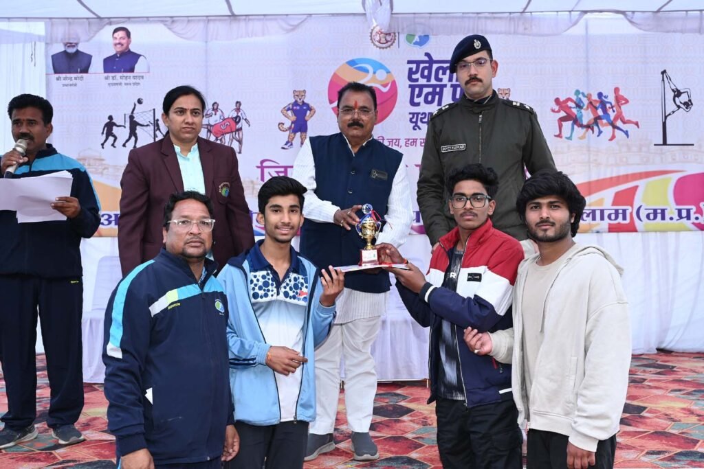 रतलाम 20 जनवरी । संचालनालय, खेल और युवा कल्याण म.प्र. भोपाल के निर्देशानुसार खेलो एम पी यूथ गेम्स का जिला स्तरीय आयोजन खेल एवं युवा कल्याण विभाग रतलाम द्वारा किया गया। जिसका समापन 20 जनवरी को हुआ। प्रतियोगिता में जिले के विकासखण्ड रतलाम, जावरा, सैलाना, पिपलौदा, आलोट, बाजना से लगभग 1200 से अधिक खिलाडियो ने सहभागिता की। आज प्रातः कॉलेज ग्राउण्ड से टार्च रैली निकाली गई। रैली को जिला अध्यक्ष प्रदीप उपाध्याय, कलेक्टर मिशा सिंह, पुलिस अधीक्षक अमित कुमार द्वारा हरी झंडी दिखाकर प्रारंभ किया गया । रैली विभिन्न मार्गो से होते हुए नेहरू स्टेडियम पोलो ग्राउंड पर संपन्न हुई। तत्पश्चात विभिन्न खेल मैदानो पर खेल प्रतियोगिताओ का आयोजन किया गया। प्रतियोगिताओं के विजेता खिलाड़ियों को पुरस्कृत किया गया। पुरस्कार वितरण समारोह के मुख्य अतिथि, जिला अध्यक्ष प्रदीप उपाध्याय, पुलिस अधीक्षक अमितकुमार, के द्वारा विजेता खिलाड़ियों को शील्ड ,मेडल एवं प्रमाण पत्र देकर उत्साहवर्धन किया गया। अतिथियों का जिला खेल और युवा कल्याण अधिकारी रुचि शर्मा द्वारा पुष्प गुच्छ से स्वागत किया गया। स्वागत उद्बोधन, जिला खेल और युवा कल्याण अधिकारी रूचि शर्मा द्वारा दिया गया। खिलाड़ियों को जिला अध्यक्ष प्रदीप उपाध्याय, पुलिस अधीक्षक अमितकुमार द्वारा संबोधित कर शुभकामनाएं दी गई । इस अवसर पर विभिन्न खेल संघ संस्थाओ के पदाधिकारी एवं विभाग के प्रशिक्षक, युवा समन्वयक उपस्थित थे। कार्यक्रम का संचालन जितेन्द्र धुलिया द्वारा किया गया एवं आभार दुर्गाशंकर मोयल ने व्यक्त किया ।