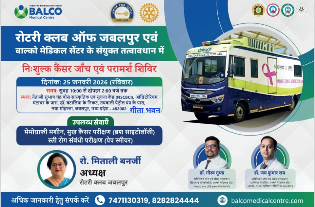 जबलपुर। रोटरी क्लब जबलपुर एवं बालको मेडिकल सेंटर, रायपुर (छत्तीसगढ़) के संयुक्त तत्वावधान में रविवार, 25 जनवरी को गीता भवन कन्वेंशन सेंटर, घंटाघर के पास, जबलपुर में एक निःशुल्क कैंसर जांच शिविर का आयोजन किया जा रहा है। रोटरी क्लब जबलपुर की अध्यक्ष श्रीमती मिताली बनर्जी ने जानकारी देते हुए बताया कि इस शिविर का मुख्य उद्देश्य आमजन में कैंसर के प्रति जागरूकता बढ़ाना एवं समय रहते जांच के माध्यम से जीवन की रक्षा करना है।