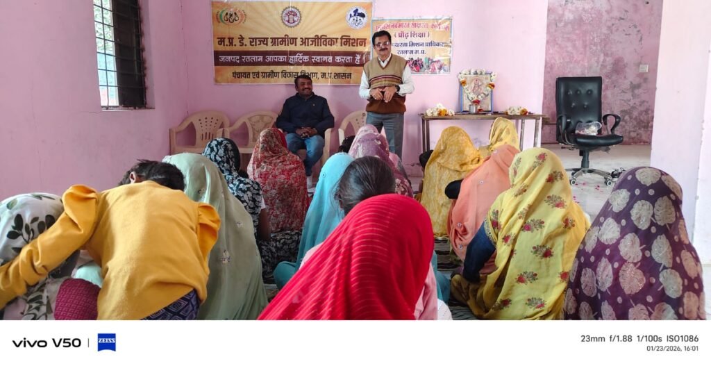 रतलाम 24 जनवरी। उल्लास नव भारत साक्षरता कार्यक्रम के अंतर्गत मध्य प्रदेश ग्रामीण आजीविका मिशन, पंचायत एवं ग्रामीण विकास विभाग तथा जिला साक्षरता मिशन प्राधिकरण प्रोढ शिक्षा के संयुक्त तत्वावधान मे कलेक्टर श्रीमती मिशा सिंह एवं सीईओ जिला पंचायत सुश्री वैशाली जैन के मार्गदर्शन में 23 जनवरी को बसंत पंचमी पर विशेष आयोजन में “अक्षरा“ शिक्षा से बदलाव की शुरुआत हर महिला साक्षर-हर, परिवार सशक्त-हर गांव प्रगति की ओर कार्यक्रम अंतर्गत सामूहिक शपथ एवं जागरूकता संवाद का आयोजन रतलाम जिले के समस्त विकासखंडों में किया गया। जिसमें साक्षर दीदियों का अनुभव तथा उनका अक्षर साथी के रूप में पंजीयन व असाक्षर दीदियों को साक्षर करने हेतु प्रशिक्षण दिया गया। इस अवसर पर आजीविका मिशन अंतर्गत बनाए समूह की महिलाओं की सक्रिय सहभागिता रही।