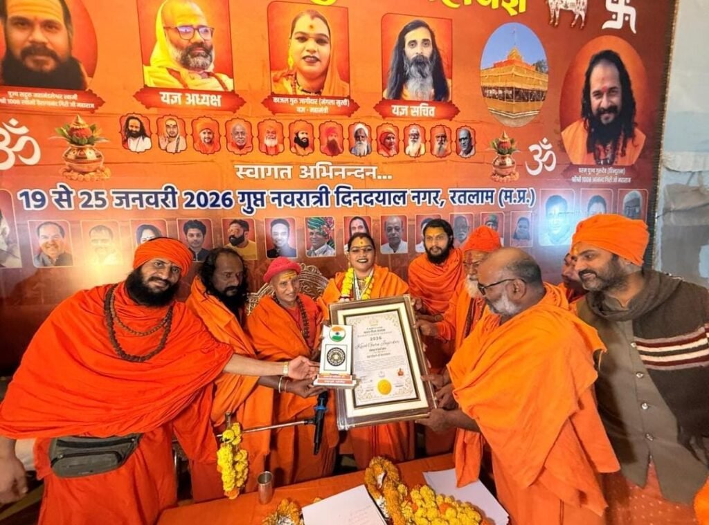 रतलाम। शिव-शक्ति हनुमत महायज्ञ के पावन अवसर पर निरंजनी अखाड़े के परम पूज्य महामंडलेश्वर द्वारा श्री श्री 1008 आनंद गिरि जी महाराज को जन-जागृति, गौमाता की रक्षा, सामाजिक समरसता एवं एकरूपता, तथा ‘एक संगत–एक पंगत’ के महा-संकल्प के लिए “हिंदू रत्न” की गरिमामयी उपाधि से अलंकृत किया गया।