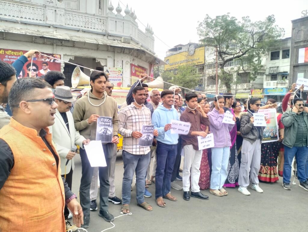 उज्जैन । भारत सरकार द्वारा उच्च शिक्षा में यूजीसी एक्ट लागू किया गया है उसके विरोध में सवर्ण समाज के आव्हान पर रविवार को उज्जैन कायस्थ समाज एवं अखिल भारतीय कायस्थ महासभा मध्यभारत जिला इकाई द्वारा टॉवर चौक पर विरोध प्रदर्शन करते हुए बच्चों को गले में प्रतीकात्मक फांसी का फंदा डालकर एक अनूठा तरीका अपनाया जिससे वहां से निकलने वाला हर व्यक्ति का मन द्रवित हो उठा । महिलाओं ने और बच्चों ने एक स्वर में कहा कि यूजीसी एक्ट सामान्य वर्ग के बच्चों के लिए एक तरह फांसी का फंदा ही है यदि सरकार ने यह एक्ट नहीं हटाया तो वह कायस्थ समाज के बच्चों को आत्म हत्या करने पर मजबूर करेगी । अखिल भारतीय कायस्थ महासभा मध्यभारत के नेतृत्व में सवर्ण समाज के आव्हान पर यह विरोध प्रदर्शन था जिसमें सवर्ण समाज के पदाधिकारियों का भी समर्थन मिला ।