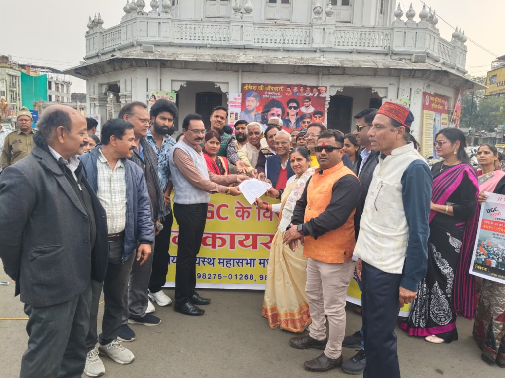 कायस्थ समाज के मोतीलाल श्रीवास्तव ने संबोधित करते हुए कहा कि विश्वविद्यालय अनुदान आयोग (यु.जी.सी) द्वारा प्रस्तावित ड्राफ्ट रेगुलेशन / नए नियम देश की उच्च शिक्षा व्यवस्था मे गहरी असमानता और भेदभाव उत्पन्न करने वाले है। यह कानून अपने वर्तमान स्वरूप में एक पक्षीय प्रतीत होता है, जिसके कारण विशेष रूप से सवर्ण वर्ग के छात्रों का शैक्षणिक और व्यवसायिक भविष्य बाधित होने की स्थिति बन रही है। शिक्षा नीति का उद्देश्य सभी वर्गों को साथ लेकर चलना होना चाहिए ना कि अगड़ा-पिछड़ा के आधार पर किसी एक वर्ग के अधिकारों का हनन कर दूसरे वर्ग के लिए भूमि तैयार करना। भारत का संविधान समानता प्रतिनिधित्व और सामाजिक न्याय की भावना पर आधारित है। ऐसे मे किसी भी निर्णय समिति का संतुलित बहुवर्गीय और समावेशी होना अनिवार्य है। एक ही जाति वर्ग द्वारा लिए गए निर्णय सवर्ण छात्रों के अधिकारों और विश्वास को प्रभावित करते है।यह देश की शिक्षा पर बहुत बड़ा आघात है।वहीं महेश पुजारी ने कहा कि युजीसी के इस एक पक्षीय एवं सवर्ण छात्रों के विरूद्व प्रभाव डालने वाले काले कानून / ड्राफ्ट रेगुलेशन को तत्काल प्रभाव से रोका जाए।सपाक्स संगठन के अध्यक्ष हीरालाल त्रिवेदी ने बोला कि नीति निर्धारण समितियों में सभी सामाजिक वर्गों को संतुलित और पारदर्शी प्रतिनिधित्व किया जाए।