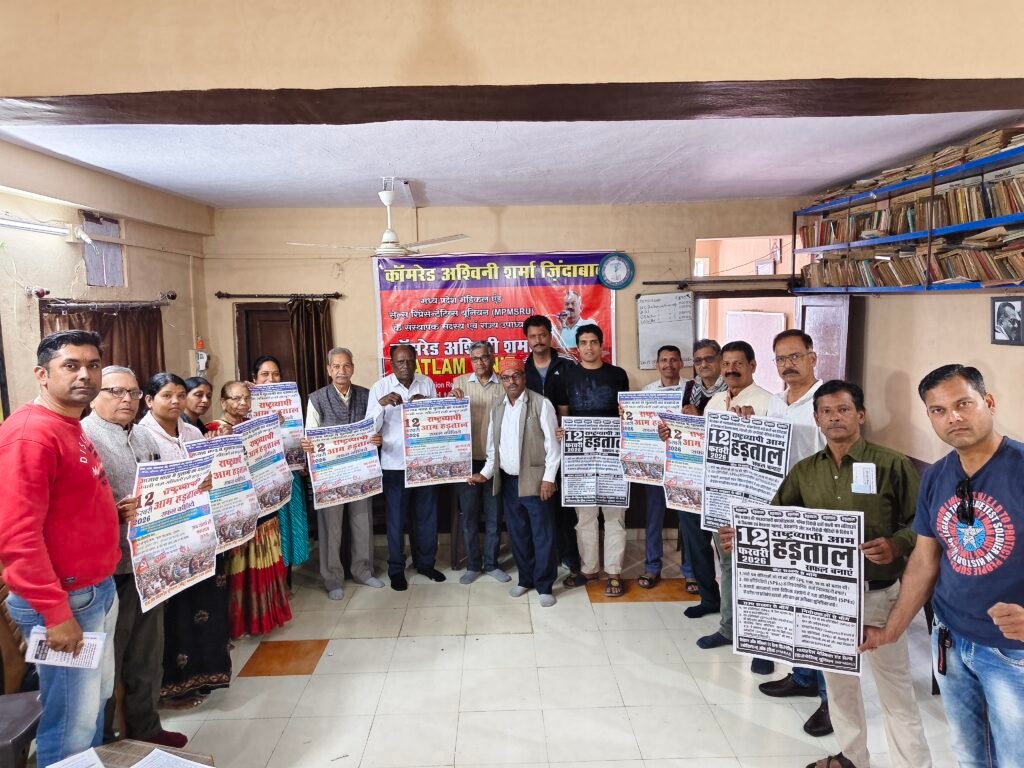 रतलाम। श्रम संगठनों के संयुक्त समिति की बैठक शास्त्री नगर स्थित MR कार्यालय में संपन्न हुई जिसमें 12 फरवरी 2026 को होने वाली देशव्यापी हड़ताल के पोस्टर का विमोचन किया गया एवं केंद्र सरकार के श्रम संबंधी काले कानून के विरोध में हड़ताल को जोर-शोर से करने की तैयारी की गई|