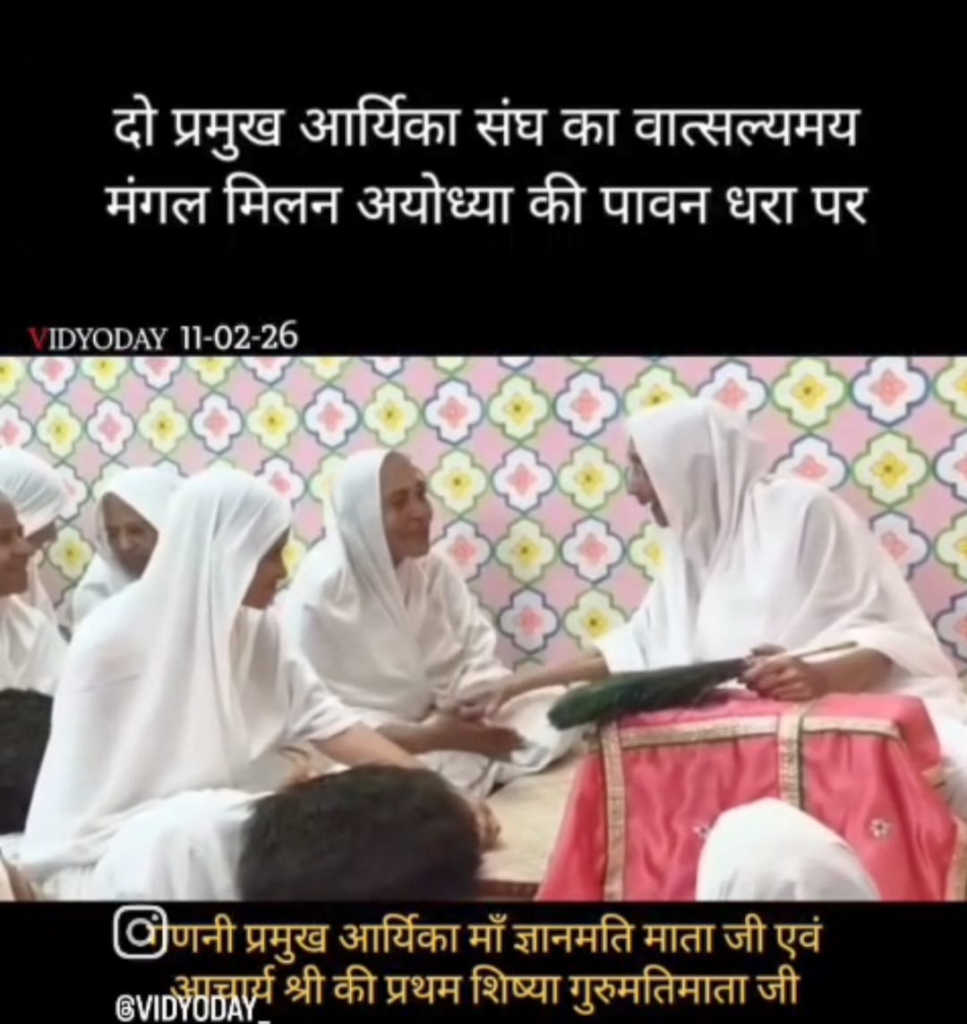 इंदौर (राजेश जैन दद्दू) । “अयोध्या” में श्रेष्ठ गणनी आर्यिका ज्ञानमती माताजी का ज्येष्ठ आर्यिका गुरुमति माताजी,दृण मति माताजी का भव्य मंगल मिलन” श्रंमण संस्कृति के समाधीष्ठ। संत शिरोमणि आचार्य गुरुदेव श्री विद्यासागरजीमहामुनिराज की प्रथम शिष्या ज्येष्ठ श्रैष्ठ आर्यिका रत्न गुरुमतिमाताजी, ज्येष्ठ श्रैष्ठ आर्यिका दृणमतिमाताजी,आर्यिका गुणमतिमाताजी स संघ सहित सभी 54 पिच्छीधारिओं का विशाल समूह तीर्थराज श्रीसम्मेदशिखर जी से चातुर्मास के उपरांत पंचतीर्थों की बंदना करते हुये भगवान श्री पारसनाथ की जन्मनगरी की बंदना करते हुये वनारस से पद विहार कर भगवान ऋषभदेव आदिनाथ भगवान की जन्म कल्याणक भूमी धर्मनगरी आयोध्या पहुंची ।