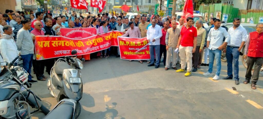 रतलाम। श्रम संगठनों की संयुक्त समिति के तत्वाधान में 12 फरवरी 2026 को राष्ट्रव्यापी हड़ताल के अंतर्गत प्रेस क्लब पर सभा संपन्न हुई इस हड़ताल में विभिन्न संगठनों के 600 से ज्यादा साथी हड़ताल पर थे ।