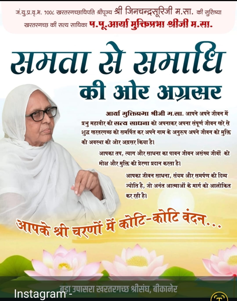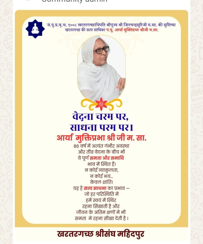 रतलाम/महीदपुर। श्रीपूज्य गुरुदेव श्री जिनचन्द्र सूरी जी महाराज साहब की सुशिष्या, आचार्य प.पू. मुक्ति प्रभा श्री जी महाराज साहब का स्वास्थ्य अत्यंत गंभीर बताया गया है। चिकित्सकों द्वारा स्वास्थ्य में सुधार की संभावना नहीं जताई गई है।
