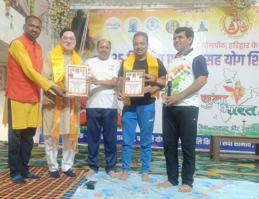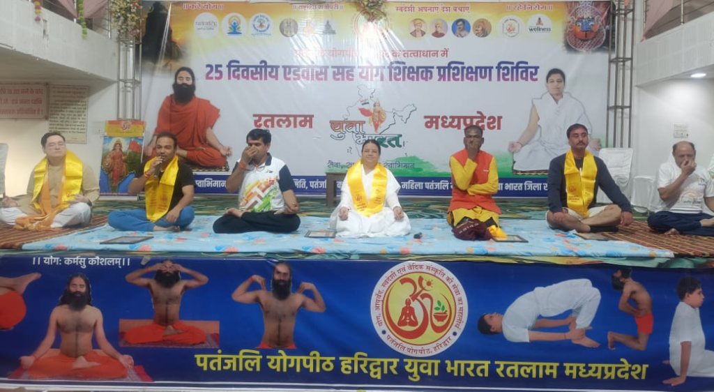 रतलाम । पतंजलि योगपीठ हरिद्वार युवा भारत जिला रतलाम पांचों संगठनों के संयुक्त तत्वावधान में 25 दिवसीय एडवांस सहयोग शिक्षक प्रशिक्षण शिविर प्रातः 06 से 08 बजे तक गुरुनानक भवन विरियाखेड़ी स्थित सफलतम 23 वा दिवस पर मुख्य अतिथि युवा समाजसेवी मदन सोनी, मनीष सोनी, महावीर इंटरकांटिनेंटल डॉ. प्रदीप जैन, ब्रह्माकुमारी बी. के. सीमा दीदी महर्षि संजय शिवशंकर दवे, अंतर्राष्ट्रीय योग मलखंभ विशेषज्ञ जितेंद्र राणावत, अनुनाद के अजीत जैन, श्रेष्ठ नवनिर्माण फाउंडेशन के नरेंद्र श्रेष्ठ, योगेश जाट टीम द्वारा स्वास्थ्य परिक्षण के माध्यम से थायराइड, शुगर, बीपी, आक्सीजन लेवल, वजन अन्य आवश्यक जांच की सेवाएँ प्रदान की गई दैनिक दिनचर्या आहार विहार में परिवर्तन के साथ शारीरिक जांचों का परिक्षण भी आवश्यक युवा हर वर्ग योग संस्कृति से जुड़े आज खेलों इंडिया द्वारा विश्व स्तरीय नेतृत्व भारत कर रहा जिसमें योग मूल भूमिका में हैं अतिथियों द्वारा अपने विचारों के साथ योग से जुड़े रहने व सदैव सहयोगी बने रहने की भावना व्यक्त की संगठन पदाधिकारियों द्वारा पुष्पमाला गमछा व अतिथि सेवा सम्मान पत्र से सम्मानित किया गया योग साधकों को पंचमुखी रुद्राक्ष भेंट किए गए जिसके उपयोग से आरोग्यता मानसिक शांति मिलती है।