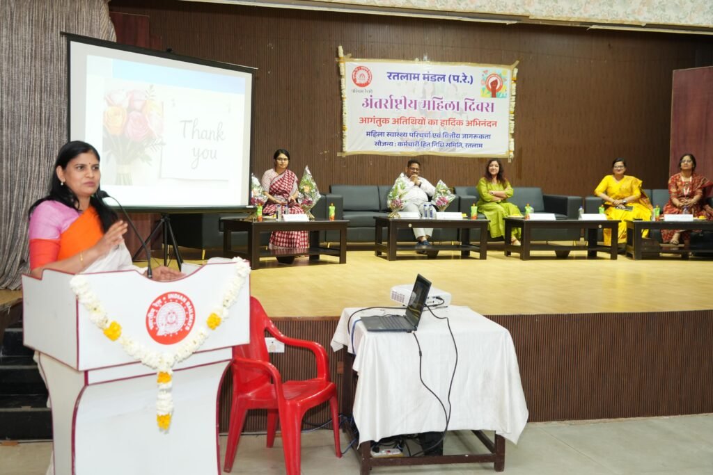 रतलाम। अंतरराष्ट्रीय महिला दिवस के अवसर पर पश्चिम रेलवे रतलाम मंडल द्वारा मंडल कार्यालय, रतलाम परिसर स्थित एनेक्सी हॉल में कर्मचारी हित निधि कमेटी के तत्वावधान में महिला स्वास्थ्य एवं वित्तीय जागरूकता विषय पर एक महत्वपूर्ण परिचर्चा का आयोजन किया गया। इस कार्यक्रम का उद्देश्य महिला रेल कर्मियों को स्वास्थ्य के प्रति सजग करना तथा उन्हें वित्तीय रूप से जागरूक और सशक्त बनाना था।