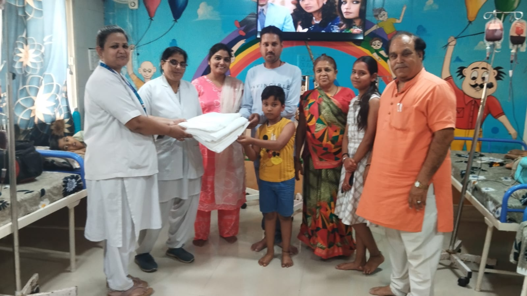 रतलाम। समाजसेवियों द्वारा काकानी सोशल वेलफेयर फाउंडेशन के सहयोग से किए जाते हैं। इसी कड़ी में आज अपनी बहन स्वर्गीय गायत्री शर्मा की स्मृति में भाई दीपक शर्मा, माता कुसुम देवी शर्मा, परिवार सदस्य कीर्ति एवं लतिका द्वारा जिला चिकित्सालय के थैलेसीमिया सीकल सेल डे केयर सेंटर, बाल चिकित्सालय वार्ड मैं आवश्यकता अनुसार बेड शीटे जिला रोगी कल्याण समिति सदस्य गोविंद काकानी, सिस्टर अलका दीदी, अर्चना दीदी को प्रदान किया।