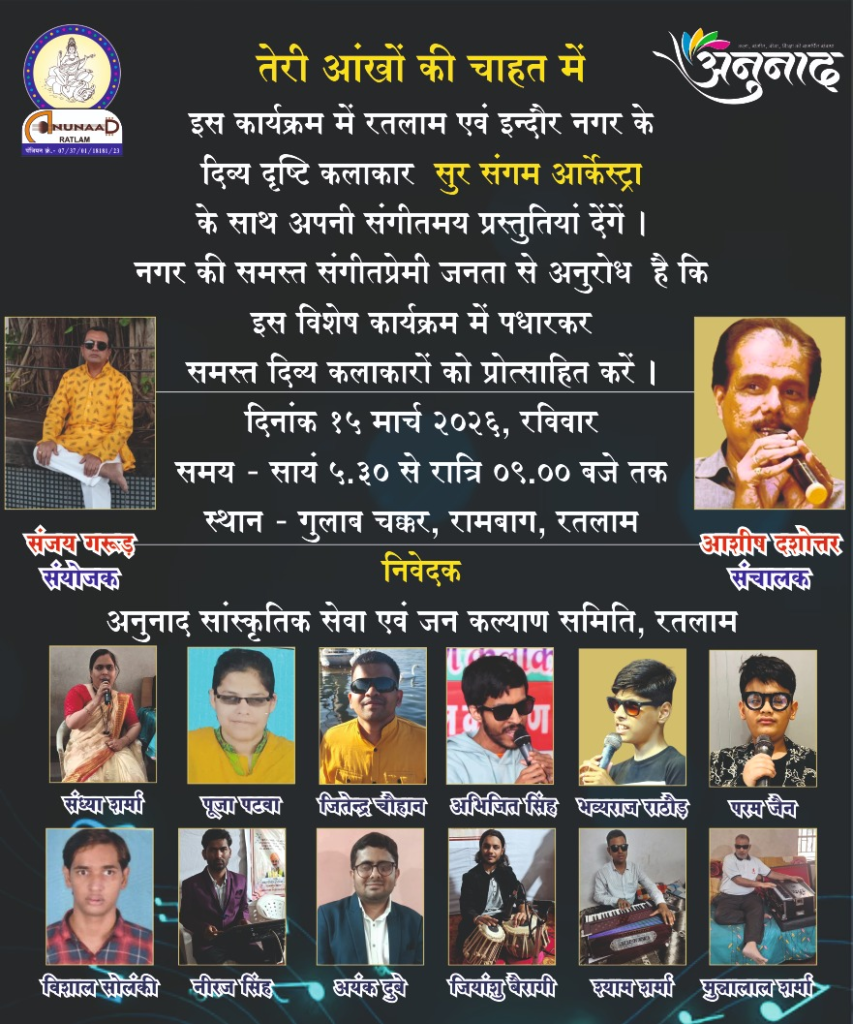 रतलाम। संगीत के बेहतरीन आयोजनों को प्रस्तुत कर रही संस्था दिव्यदृष्टि कलाकारों की संगीतमय पेशकश ‘ तेरी आंखों की चाहत में ‘ का आयोजन 15 मार्च रविवार को सायं 6 बजे से गुलाब चक्कर रतलाम में कर रही है। इस आयोजन में गायक एवं संगीतकार सभी दिव्य दृष्टि कलाकार हैं। इन कलाकारों ने अपनी शारीरिक कमी को अपनी प्रतिभा के दम पर बौना साबित किया है और संगीत के क्षेत्र में खास मुकाम बनाया है। उक्त जानकारी देते हुए अनुनाद के अध्यक्ष अजीत जैन ने बताया कि तेरी आंखों की चाहत में कार्यक्रम में रतलाम और इंदौर के दिव्यदृष्टि कलाकारों की संगीतमय पेशकश सुर संगम आर्केस्ट्रा के संजय गरूड़ के निर्देशन में होगी वाली । इस प्रस्तुति में बीस से अधिक गीतों की प्रस्तुति दी जाएगी।