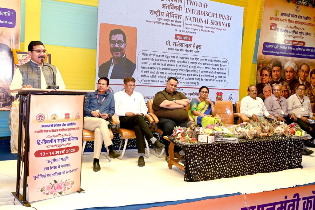 मुख्य अतिथि मप्र लोकसेवा आयोग, इंदौर के अध्यक्ष प्रो. राजेश लाल मेहरा ने कहा कि अनुसंधान वह सत्य है जो आत्मा की ओर बढऩे की प्रेरणा देता है। उन्होंने कहा कि आत्मा का अनुसंधान ही सबसे बड़ा अनुसंधान है, जो व्यक्ति को स्वयं को जानने में सहायता करता है। उन्होंने रतलाम महाविद्यालय में हिंदी के प्राध्यापक के रूप में बिताए अपने समय को याद करते हुए कहा कि सेमिनार में शोधार्थियों और विद्यार्थियों की बड़ी संख्या आयोजन की सफलता को दर्शाती है। उन्होंने कहा कि जीवन में कर्म और पुरुषार्थ का विशेष महत्व है तथा अनुसंधान केवल अध्ययन का विषय नहीं बल्कि जीवन जीने का माध्यम भी है।