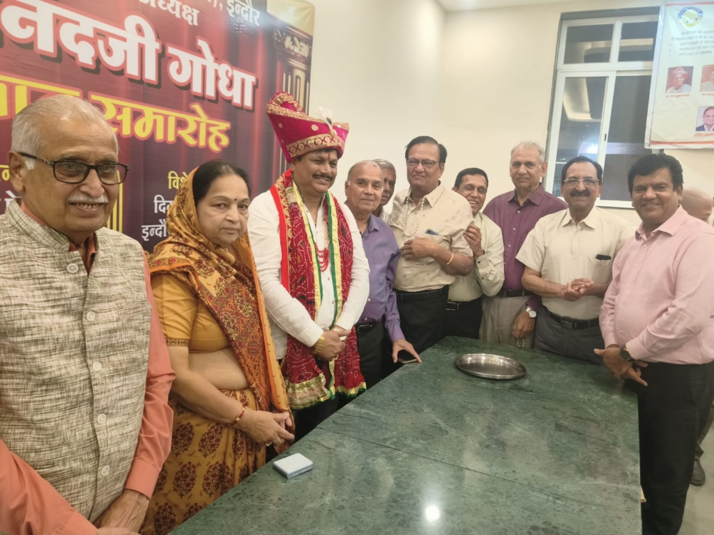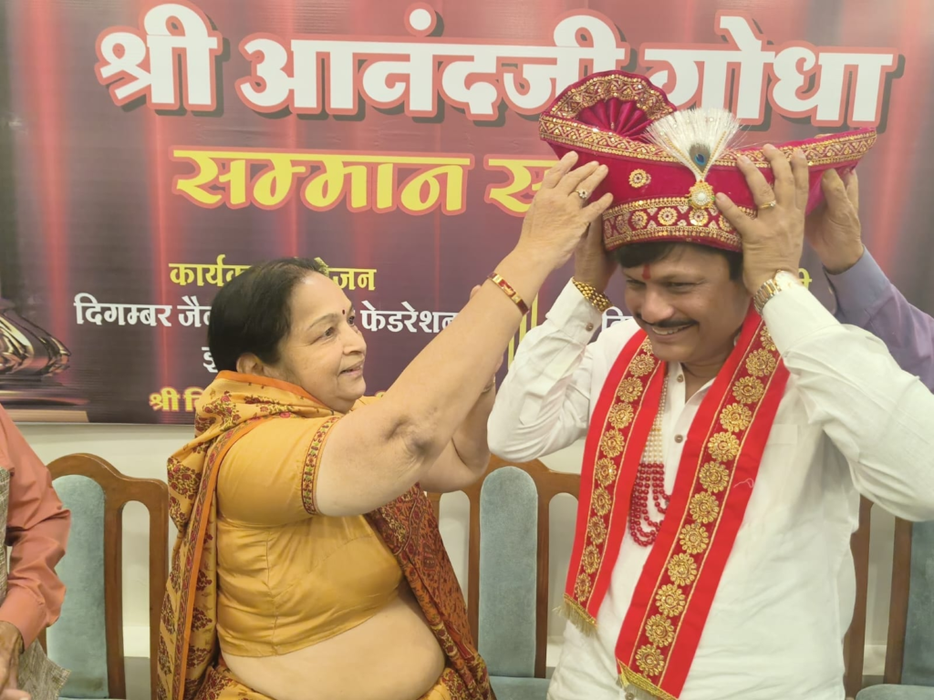इंदौर (राजेश जैन दद्दू) । दिगंबर जैन समाज सामाजिक संसद के नवनिर्वाचित अध्यक्ष आनंद गोधा का दिगंबर जैन सोशल ग्रुप फेडरेशन के तत्वावधान में आयोजित सम्मान समारोह में फेडरेशन सहित समाज की 65 संस्थाओं ने शाल श्रीफल, मोतियों की माला दुपट्टा और पगड़ी पहनकर का उनका सम्मान किया। उदासीन आश्रम स्थित कुंदकुंद ज्ञानपीठ परिसर के सभागृह में आयोजित समारोह में अपने सम्मान के प्रति आभार एवं मन की बात मन से करते हुए गोधा ने कहा कि मैं मान, सम्मान और अभिमान के लिए अध्यक्ष नहीं बना हूं मेरी जीत आप सब की जीत है।