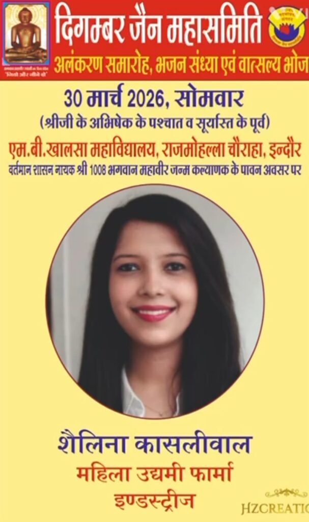 इंदौर (राजेश जैन दद्दू) । ऐतिहासिक महावीर जन्म कल्याणक महोत्सव के पावन अवसर पर, दिगंबर जैन महासमिति, इंदौर संभाग द्वारा आयोजित यूथ आइकन अवार्ड अलंकरण समारोह में समाज की होनहार बेटी शैलिना प्रकाश कासलीवाल को “जैन गौरव अलंकरण” से सम्मानित किया गया।