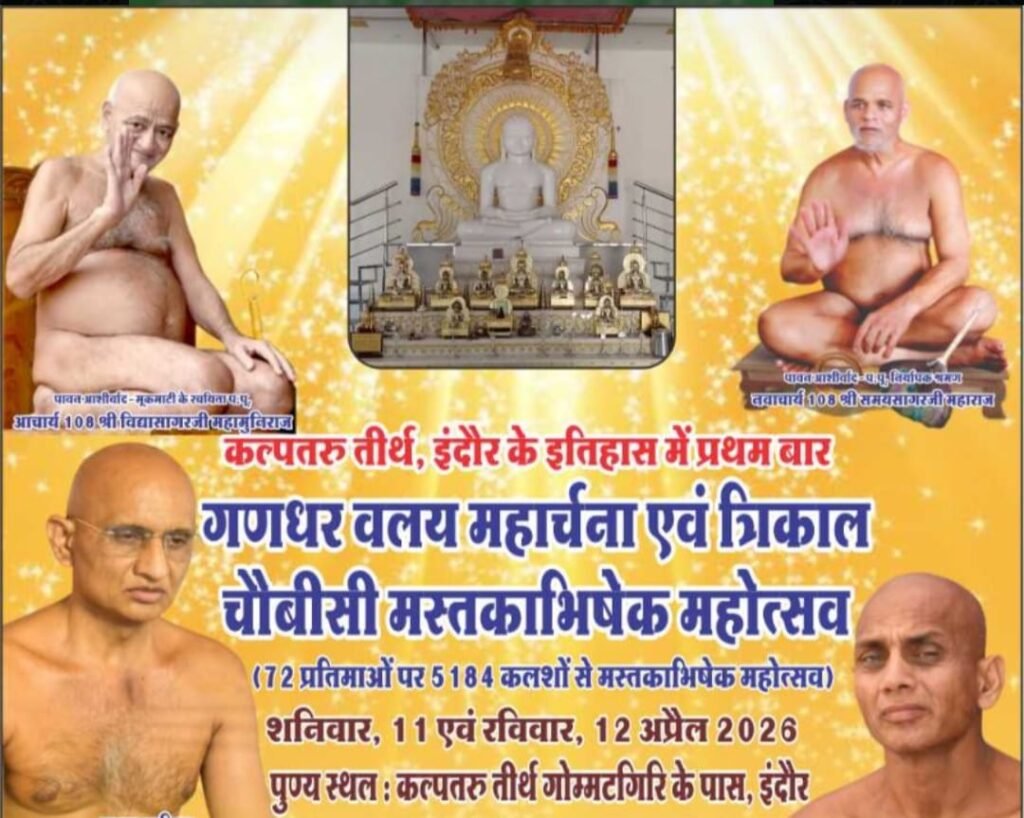 इंदौर (राजेश जैन दद्दू)। संत शिरोमणि आचार्य श्री विद्या सागर जी वर्तमान आचार्य श्री समय सागर महाराज जी के आशीर्वाद से परम कुल गोरव आशीआशीष प्रदाता परम आज्ञानुवर्ती शिष्य परम पूज्य गुरुदेव श्री विमल सागर जी महाराज एवं मुनि श्री अनंत सागर जी के संसंघ के सानिध्य में भव्यतिभव्य तीन वर्ष में एक बार होने वाले मस्तकाभिषेक महोत्सव में आप सभी सादर आमंत्रित हैं। आयोजन 10, 11 एवं 12 अप्रैल 2026 को आयोजित किया जा रहा है।