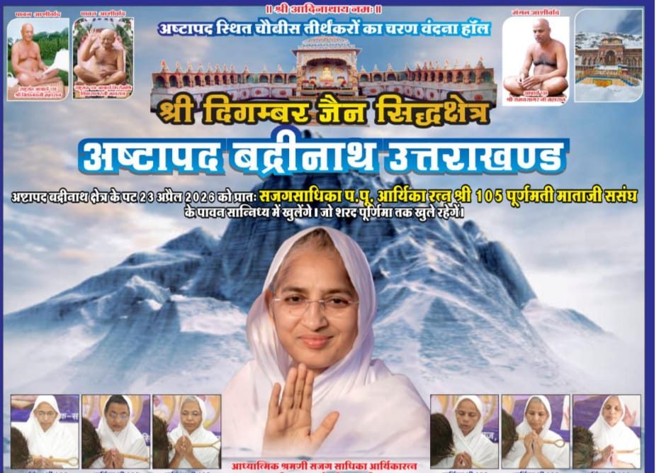 इंदौर/अष्टापद (उत्तराखंड) (राजेश जैन दद्दू) | श्री दिगम्बर जैन सिद्धक्षेत्र अष्टापद-बद्रीनाथ, उत्तराखंड में 23 अप्रैल गुरुवार 2026 से पावन कपाट खुलने जा रहे हैं। यह शुभ अवसर पर श्रंमण संस्कृति आचार्य श्री विद्यासागर नवाचार्य श्री समय सागर जी महाराज की शिष्य सजग साधिका प. पू. आर्यिका रत्न श्री 105 पूर्णमती माताजी संसघ के पावन सानिध्य में संपन्न होगा। धर्म समाज प्रचारक राजेश जैन दद्दू ने कहा कि कपाट खुलने के साथ ही यह क्षेत्र श्रद्धालुओं के लिए शरद पूर्णिमा तक दर्शन हेतु खुला रहेगा।