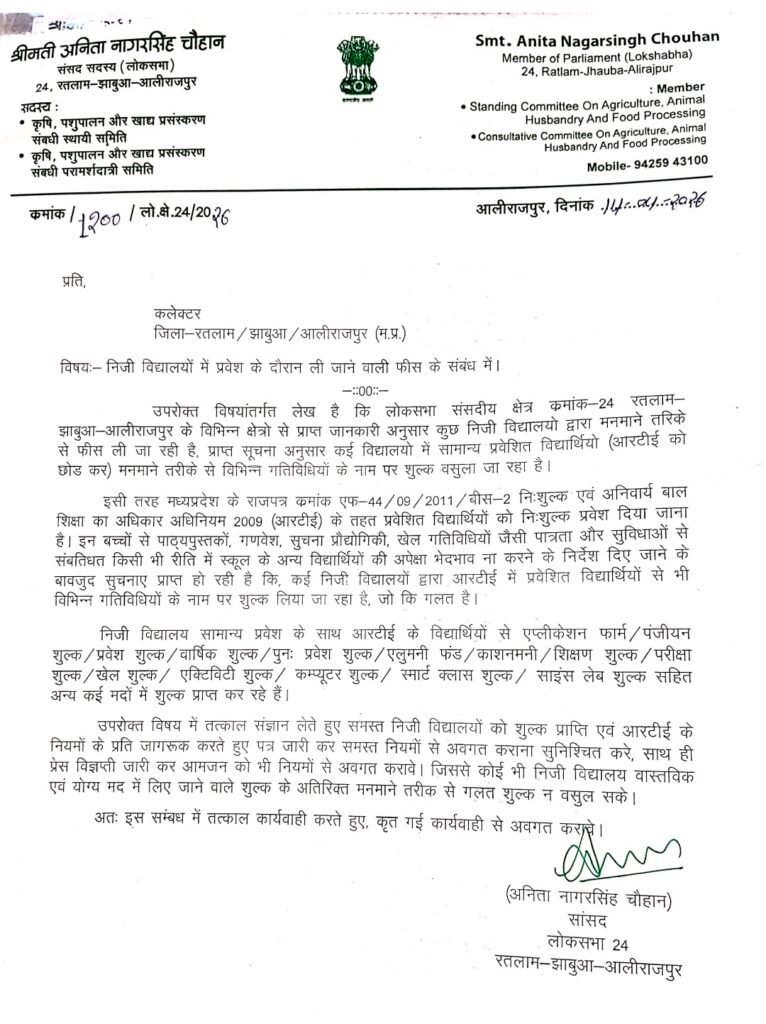 सांसद श्रीमती अनिता चौहान ने बताया कि मध्यप्रदेश सरकार के राजपत्र क्रमांक एफ – 44/09/2011/20-1 में दिए निर्देशानुसार आरटीई के तहत प्रवेशित बच्चों को निःशुल्क शिक्षा के साथ पाठ्यपुस्तक, गणवेश, आईटी सुविधाएं और खेल गतिविधियों जैसी सभी सुविधाएं बिना किसी भेदभाव के उपलब्ध कराई जानी चाहिए। इसके बावजूद मिल रही सूचनाएं अनुसार कुछ निजी विद्यालयों द्वारा इन विद्यार्थियों से भी अलग-अलग मदों में शुल्क ले रहे हैं, जो नियमों का उल्लंघन है।
