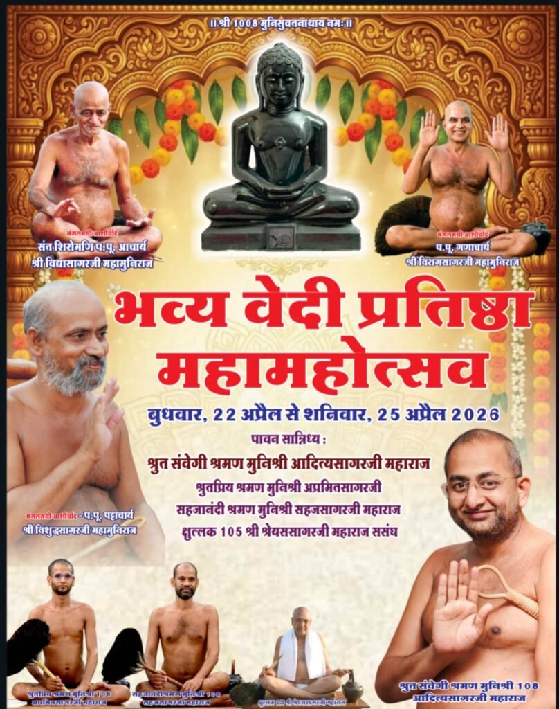 श्री 1008 मुनिसुव्रतनाथ दिगम्बर जैन मंदिर ट्रस्ट ने सकल जैन समाज एवं समस्त धर्मानुरागी बंधुओं से 22 से 25 अप्रैल 2026 तक आयोजित वेदी प्रतिष्ठा महामहोत्सव में सपरिवार पधारकर अपनी गौरवमयी उपस्थिति से आयोजन को गरिमा प्रदान करने का विनम्र आग्रह किया है।